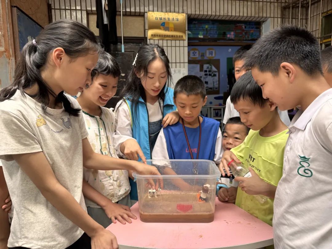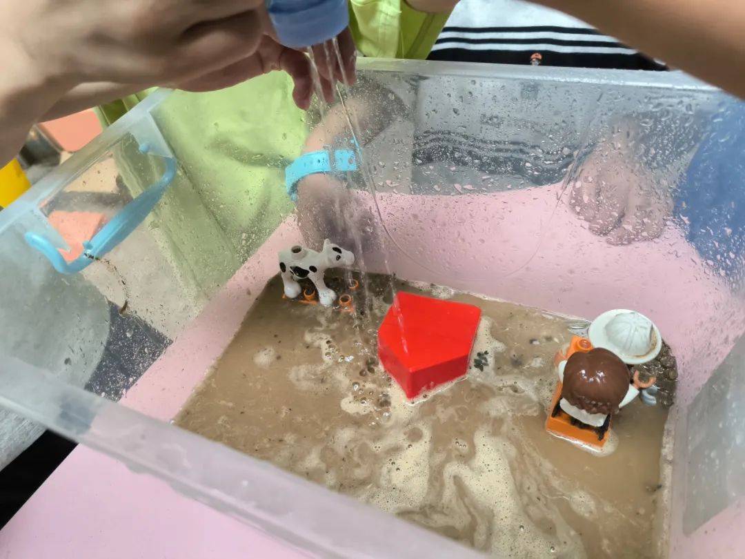 小朋友们分组协作,利用发放物资在透明盒中搭建“家园”并安置玩偶居民。通过模拟小雨至暴雨的渐变过程,孩子们屏息观察水流如何冲击建筑,亲身体验洪水威力,深刻理解“高地避险”的现实意义。社工向小朋友们询问“你观察到了什么?这种情况下可以我们可以做些什么呢?”