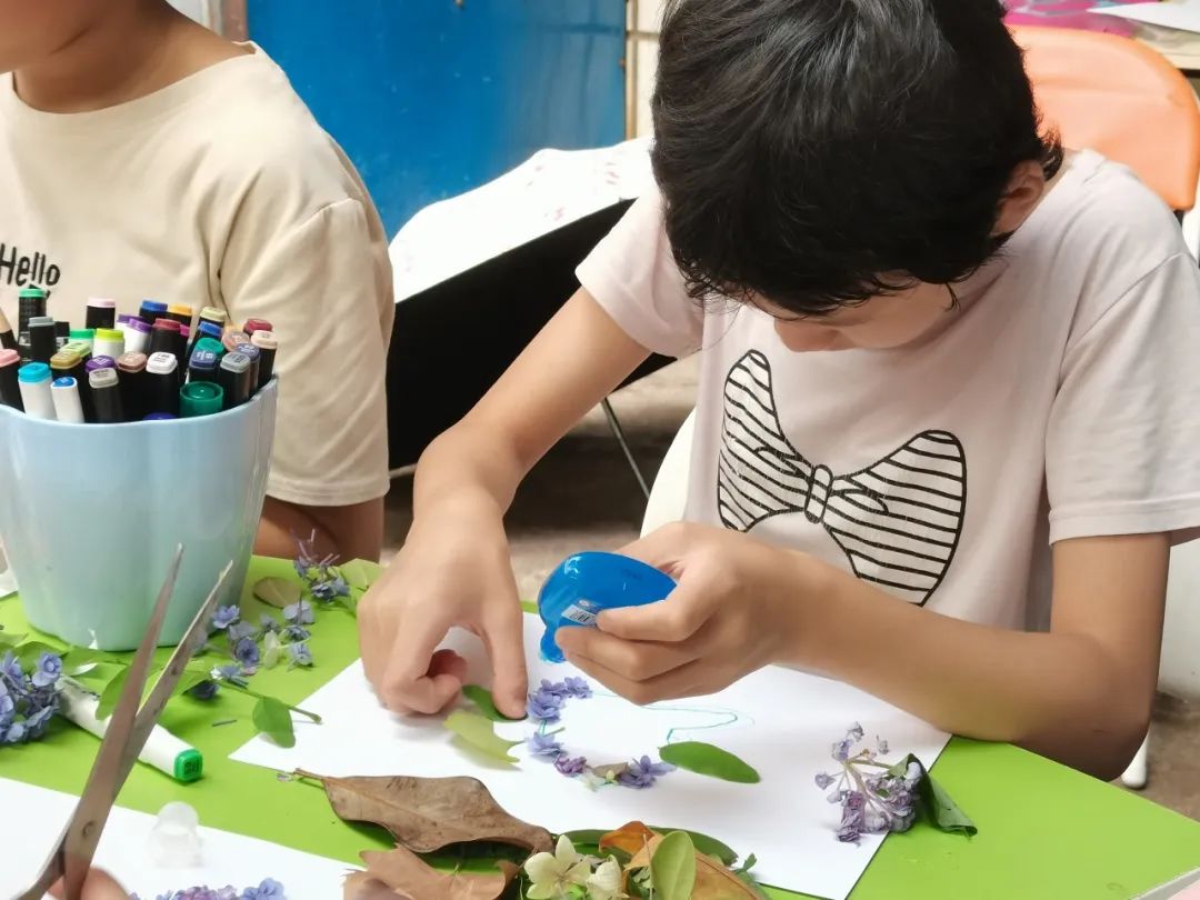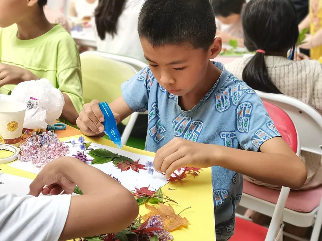 回到启乐空间城长生活馆后,创作剪秋作品的序曲正式奏响。小朋友们迫不及待地拿出捡来的树叶,结合剪刀、胶水、彩纸等工具材料,全身心投入到创作中。他们发挥着自己的想象力与创造力,有的将树叶拼贴成蝴蝶的形状,有的把树叶拼成了一棵“花树”……