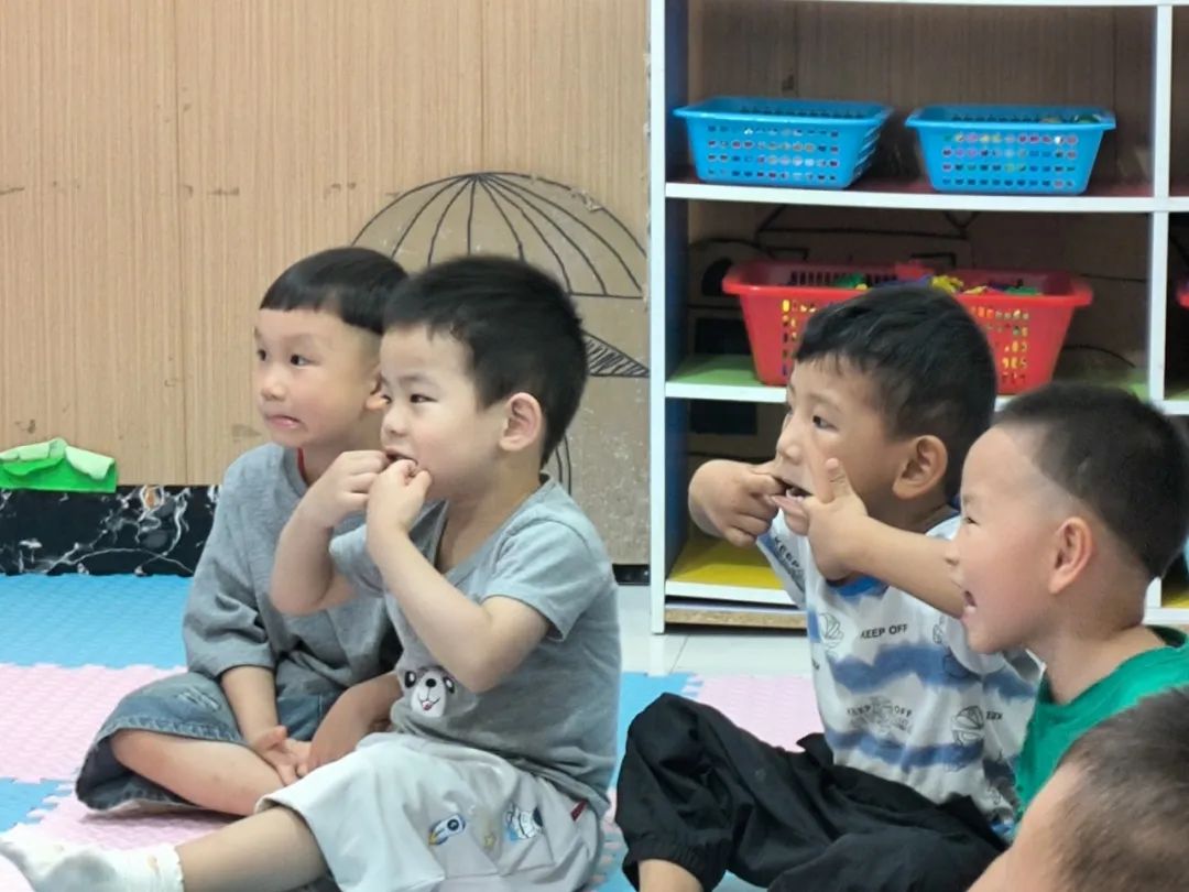 社工接着张大嘴巴做了个“咿”的嘴部动作:“快看,这样就能看到牙齿啦!”孩子们立马跟着咧开嘴,小手还伸到嘴边想摸摸。几个活泼的小朋友已经迫不及待地凑到社工姐姐面前,踮着脚尖要看清楚她的牙齿。